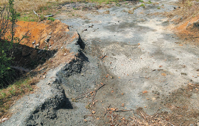 在新義公司北側,這條運煤公路的起點,記者遠遠望見一些土地是黑色的。這是一處讀者來信裏所説的煤渣傾倒地,煤渣讓這片土地呈現黑色(見圖①)。有的煤渣成堆堆放在路邊;有的平鋪在地裏,形成20至60釐米不等的厚厚的煤土層。