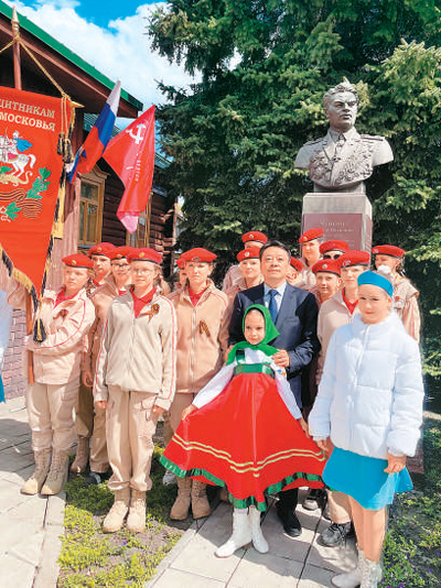 近日,吳昊(中)受邀來到崔可夫元帥故居博物館參加紀念蘇聯偉大衞國戰爭勝利80週年的慶典活動,與俄羅斯青少年在一起。