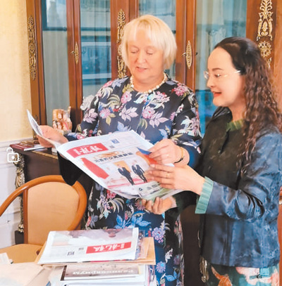 李雙傑(右)向俄羅斯友人展示《龍報》。