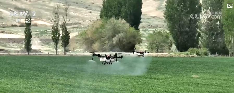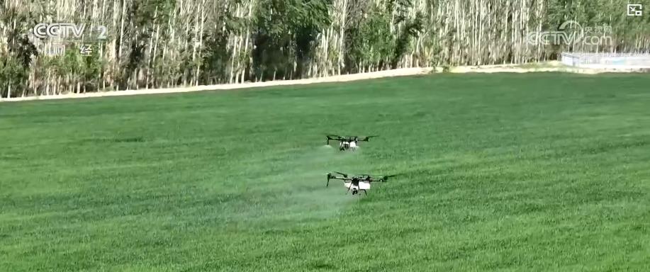 這兩天,在昌吉州瑪納斯縣樂土驛鎮鄭家莊村千畝冬小麥地裏,農户正在操作植保無人機噴灑植物抽穗期間所需的混合液,促進小麥生長發育。