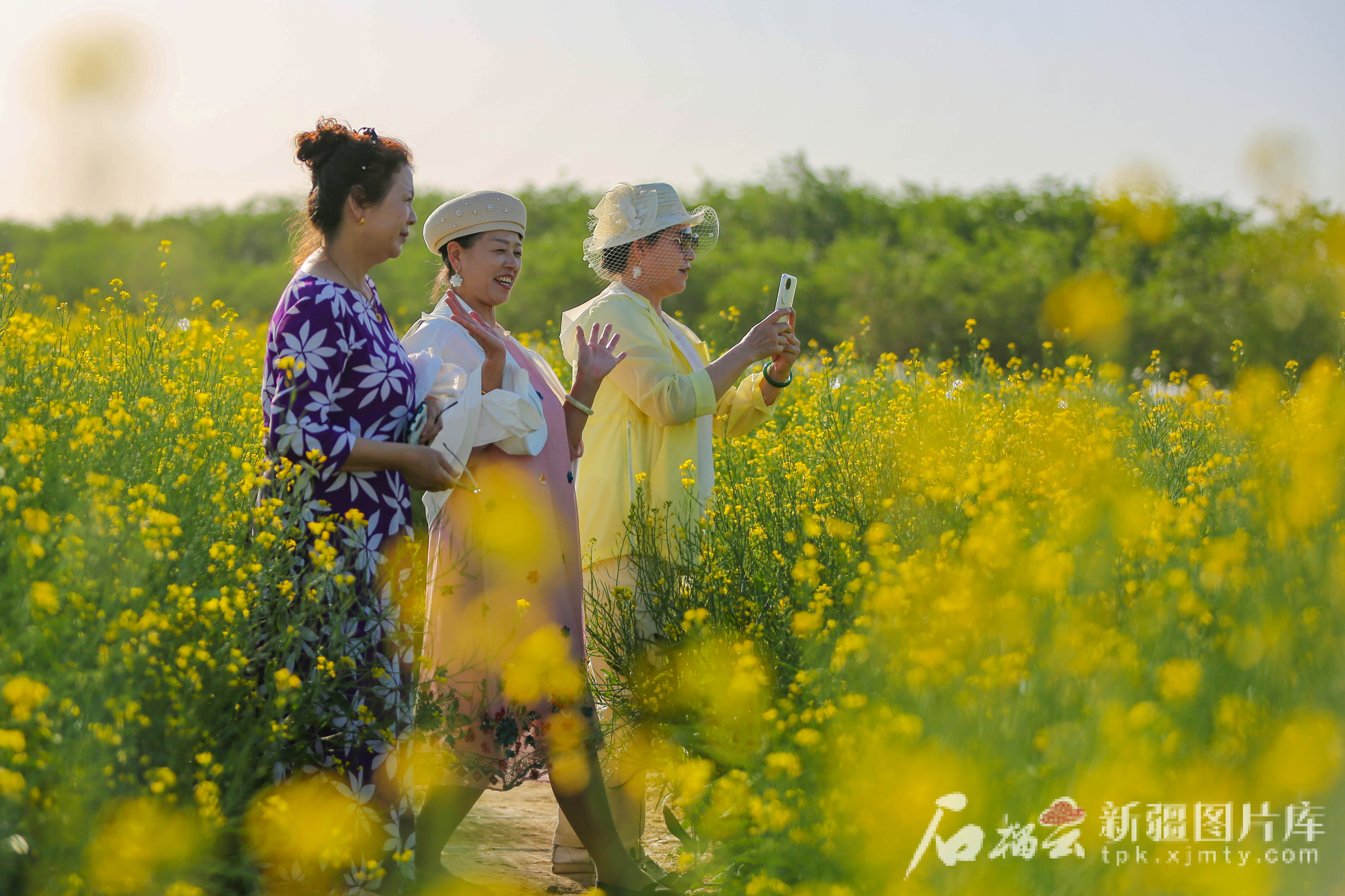 5月9日,遊客在昌吉市六工鎮十三户村千畝油菜花田景區拍照。