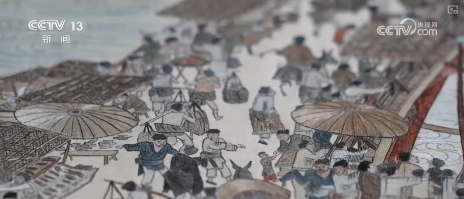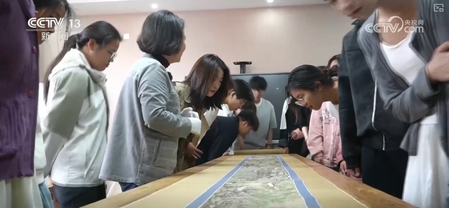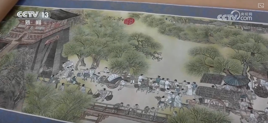 這幅汴繡作品按照原作5.28米的長度進行繡制,用到的針法有18種。隨着卷軸的徐徐打開,同學們彷彿一下子回到了繁華熱鬧的宋朝。繪畫藝術融合針線語言,將原作中800多個的人物,以及動物、船隻、建築等複製在汴繡藝術的長卷上。