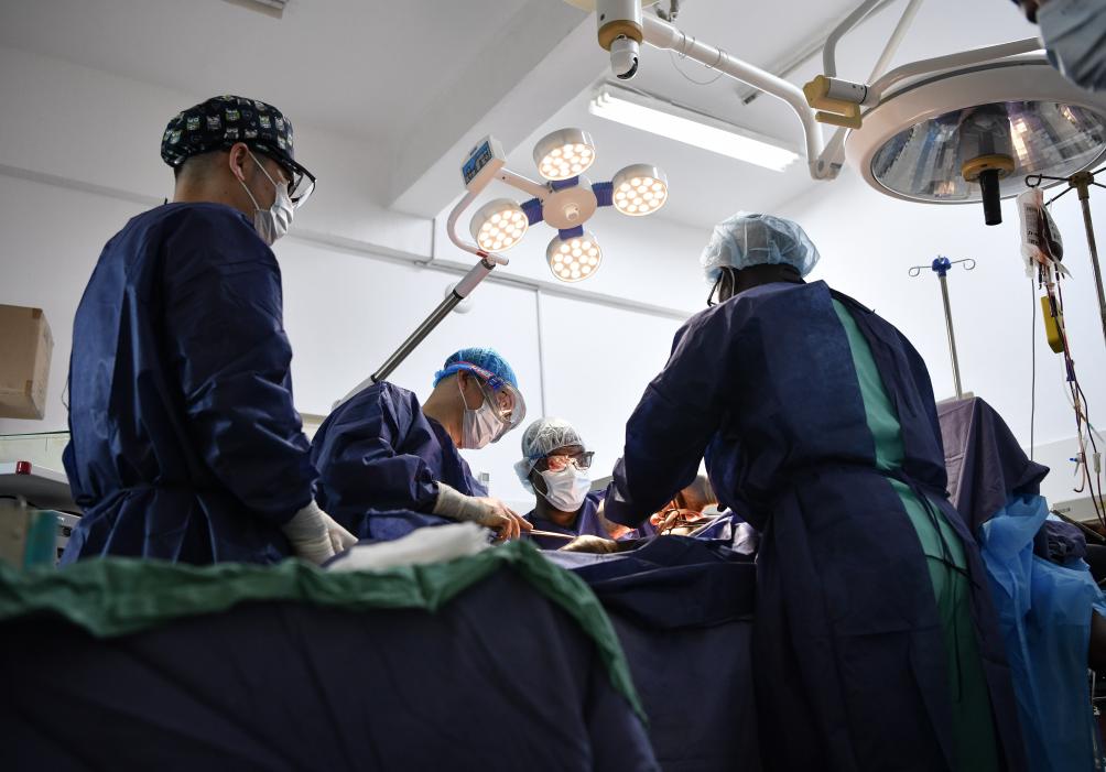 2025年4月29日,在位於幾內亞首都科納克里的中幾友好醫院,中方醫生與當地醫生為患者做手術。新華社記者韓旭攝