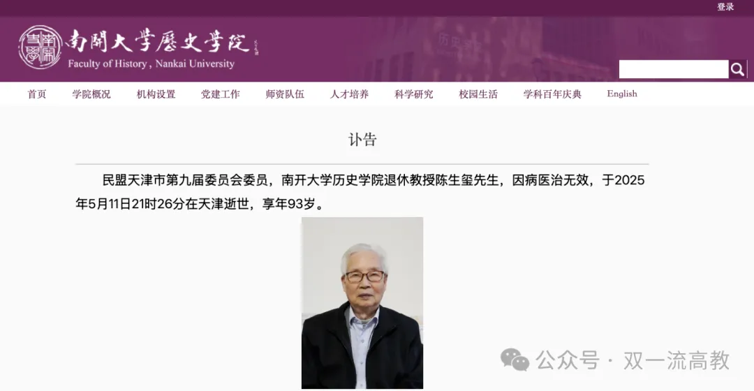 據南開大學歷史學院消息,民盟天津市第九屆委員會委員,南開大學歷史學院退休教授陳生璽先生,因病醫治無效,於2025年5月11日21時26分在天津逝世,享年93歲。