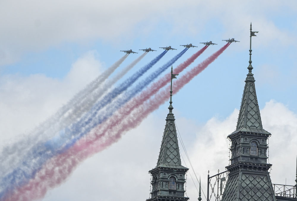 克里姆林宮斯巴斯基鐘樓上,巨大的自鳴鐘指針指向10時,悠揚的鐘聲響徹紅場。俄羅斯軍樂隊奏響《神聖的戰爭》樂曲,儀仗隊護衞俄羅斯國旗、偉大衞國戰爭勝利旗入場。