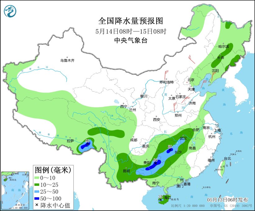 *5月14日08時至15日08時,*吉林中部和東部、遼寧北部、湖北東部和南部、安徽西南部、江西西北部、湖南大部、廣西西部和北部、海南島、四川南部、雲南中東部、貴州東部和南部、西藏東部等地部分地區有中到大雨,其中,西藏東南部、湖南中部、貴州東南部、廣西北部等地部分地區有暴雨(50~90毫米)。內蒙古東南部和西北部、遼東半島、華北南部等地部分地區有4~5級風(見圖2)。