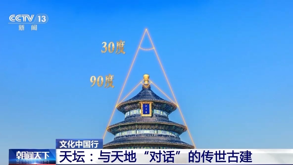 專家介紹,如果將祈年殿三層屋頂邊線相連,與鎏金寶頂中線在天空相交,夾角近三十度,而連接最上層屋頂邊沿與中線,又可以構成近乎九十度的直角,呈現完美穩定的三角形構圖。祈年殿的設計既盡顯建築的和諧之美,又兼顧了實用性。