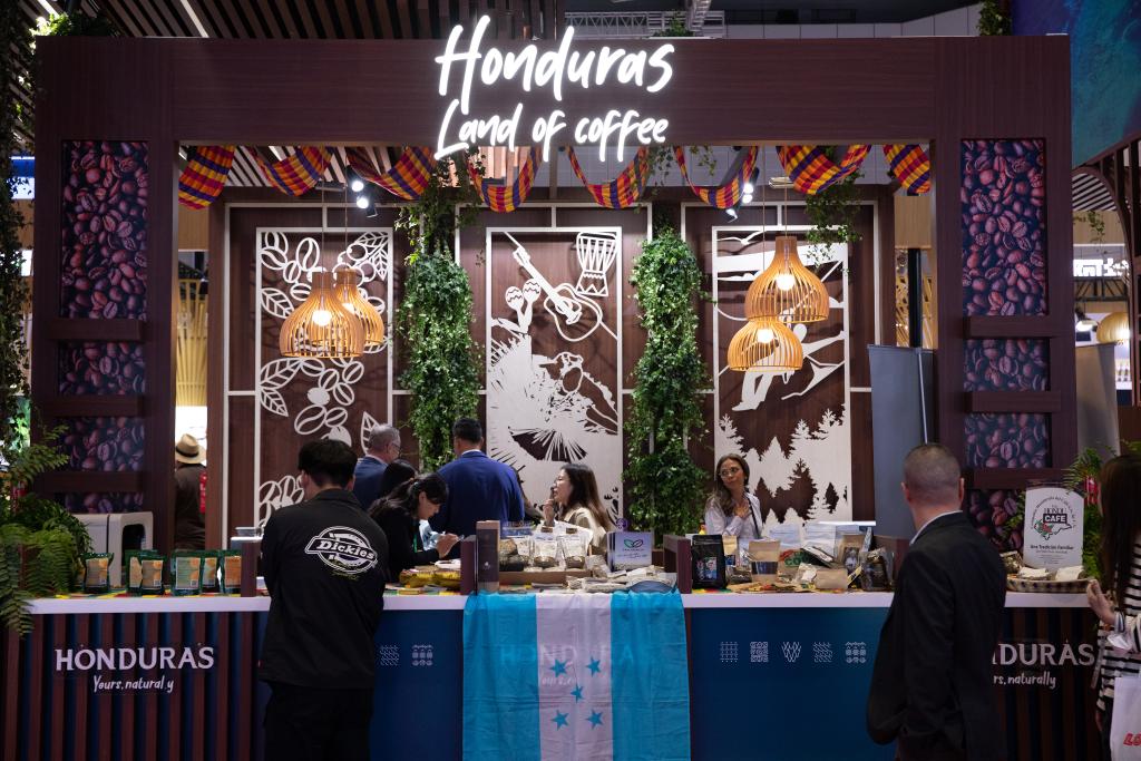 2023年11月6日,參觀者在第六屆進博會國家展洪都拉斯展台諮詢咖啡豆等展品信息。新華社記者 金立旺 攝