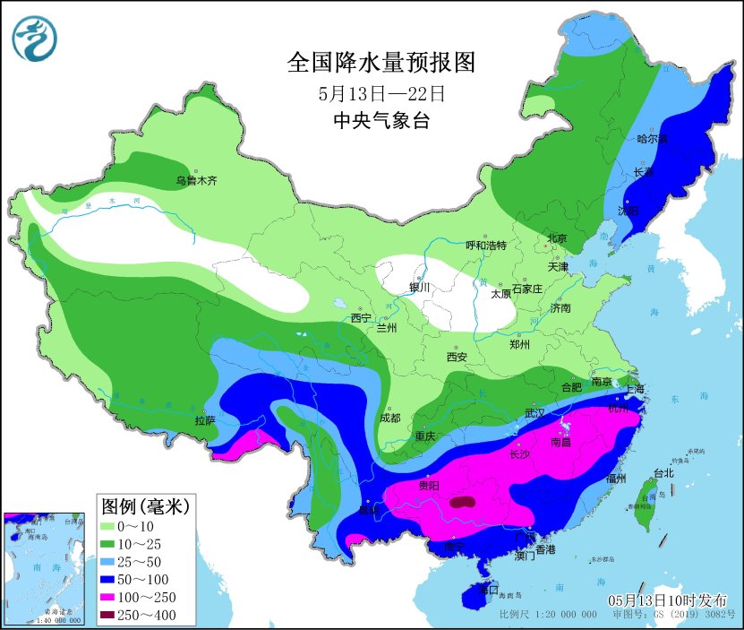 未來10天(5月13-22日),江南、華南西部、貴州大部、四川西部和南部、西藏東部、雲南東部以及東北地區東部等地累計降水量有50~80毫米,其中江南中東部和南部、華南西部、雲南東南部的部分地區有90~150毫米,局地超過200毫米;江南大部、華南西部、雲南東部、貴州大部、東北地區大部、川西高原、西藏東部等地累計降水量較常年同期偏多3~6成,部分地區偏多1~2倍,我國其餘大部地區降水偏少。
