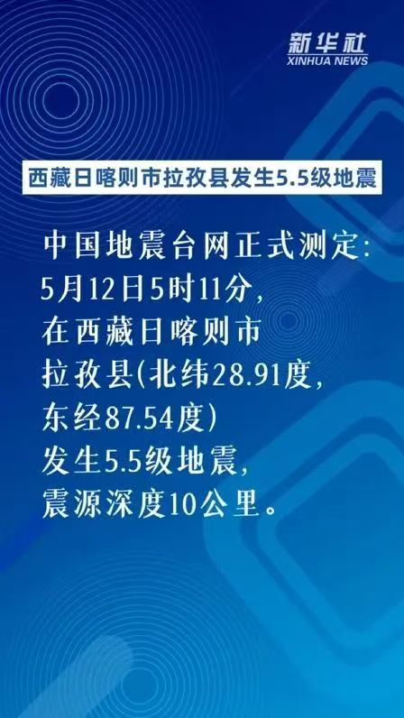 根據中國地震台網正式測定:5月12日5時11分,在西藏日喀則市拉孜縣(北緯28.91度,東經87.54度)發生5.5級地震,震源深度10公里。