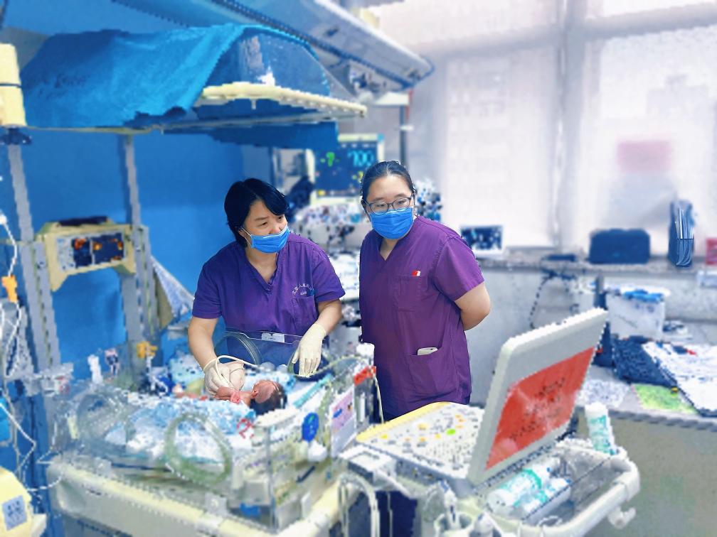 北京兒童醫院新生兒重症監護病房護士長鍾學紅(左一)正在為重症新生兒進行護理。(北京兒童醫院供圖)