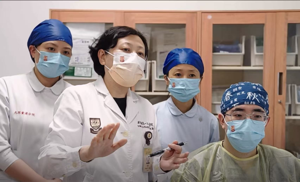 邢紅(左二)指導年輕護士進行PICC置管操作。(上海市第一人民醫院供圖)