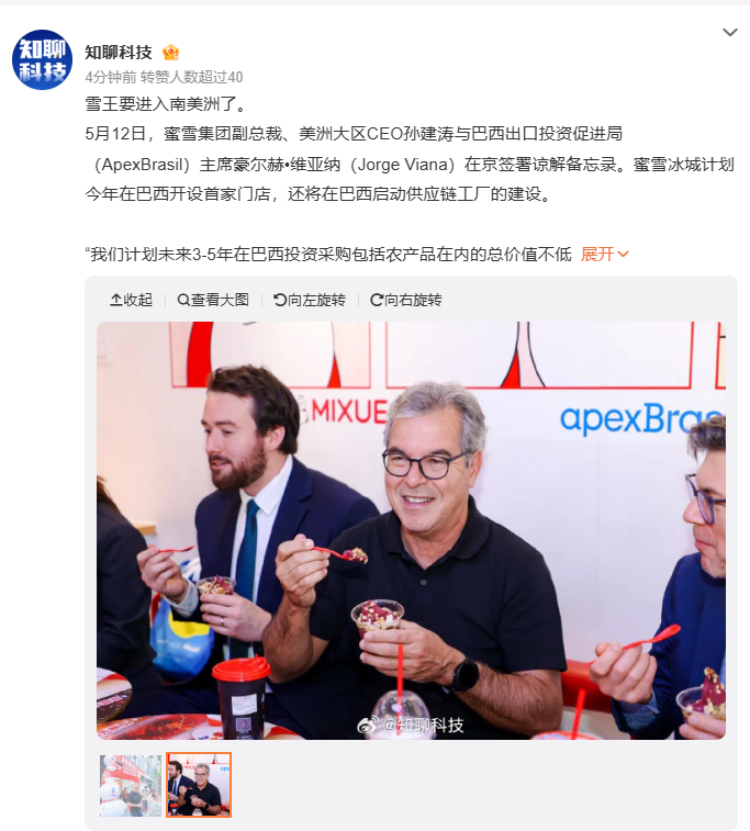 【環球網財經綜合報道】5月12日,在巴西總統盧拉見證下,蜜雪集團副總裁、美洲大區CEO孫建濤與巴西出口投資促進局主席豪爾赫•維亞納在京簽署《諒解備忘錄》,該備忘錄作為“中國 - 巴西商業研討會”成果,推動雙方經貿合作深化。