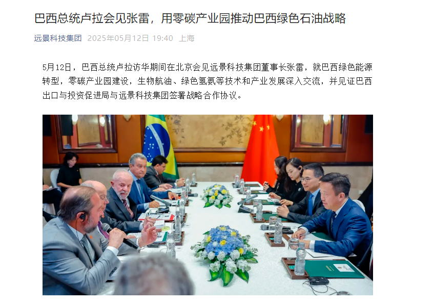 在此背景下,巴西總統盧拉訪華期間,於5月12日在北京會見遠景科技集團董事長張雷,就一系列能源合作議題展開深入交流,並見證重要合作協議簽署。