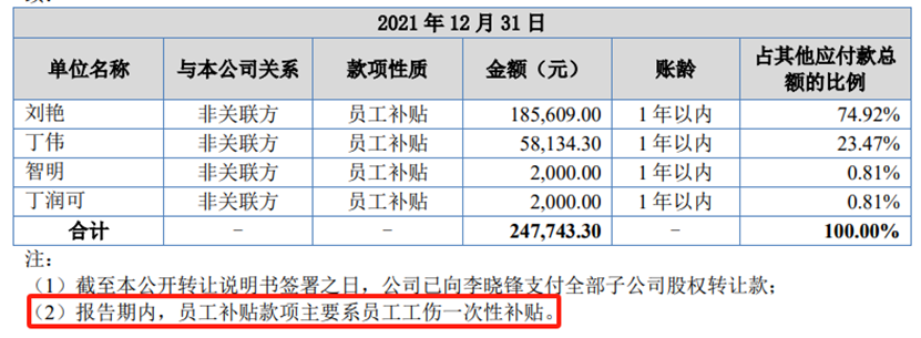 招股書披露,截至上市前公司存在一筆賬齡超過3年的其他應付款,是對員工劉豔應支付的員工補貼。對此,在本次申請北交所IPO披露的招股書中並未做出詳細説明,但在公司此前發佈的《公開轉讓説明書》中披露,該筆支出形成於2021年,補貼性質為“員工工傷一次性補貼”。