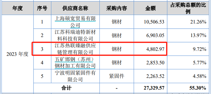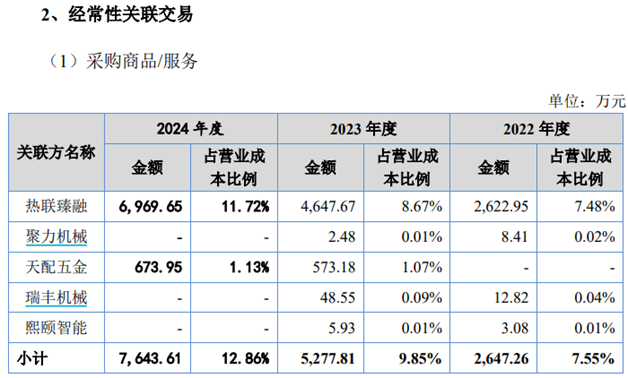 此外,熱聯臻融是酉立智能的關聯方,招股書披露,其是公司實際控制人、董事長李濤擔任董事的公司,同時酉立智能與該關聯方保持了大金額的關聯交易,對此公司披露到:報告期前,公司便與熱聯臻融母公司杭州熱聯集團股份有限公司保持合作關係,經雙方協商,2022年起由熱聯臻融向公司供應鋼材。公司向熱聯臻融採購鋼材均履行採購比價流程,交易定價公允。
