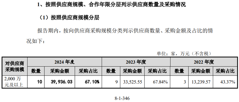 還有,根據《第一輪審核問詢函的回覆》第346頁披露,在2023年的主要供應商中,涉及採購規模超過2000萬元的供應商數量為9家,合計採購金額對應33525.55萬元。與此同時,根據招股書第173頁披露的主要供應商信息顯示,2023年前5大供應商對應採購金額均超過2000萬元,合計金額為27329.57萬元。進而意味着,公司向另外4家採購金額超過2000萬元的供應商,合計採購金額為6195.98萬元。
