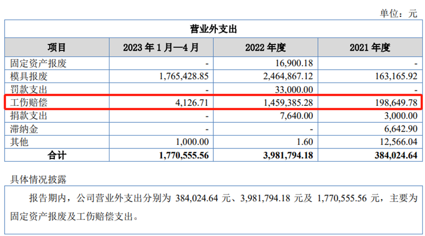 這就意味着公司在2021年發生過生產事故,並導致員工出現工傷,因此導致需向劉豔支付金額高達18.56萬元的補貼賠償。但是針對這起工傷事件,招股書和《公開轉讓説明書》中均未做出披露。