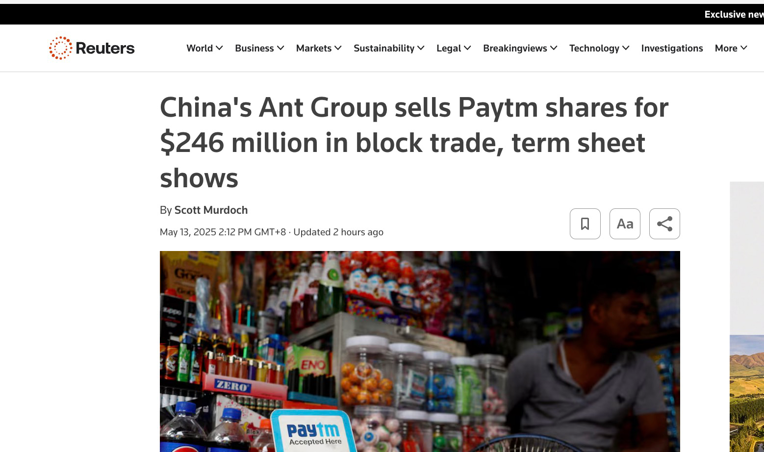 【環球網科技綜合報道 記者 李文瑤】5月13日消息,據路透社消息,螞蟻集團已出售印度 Paytm 公司股票。