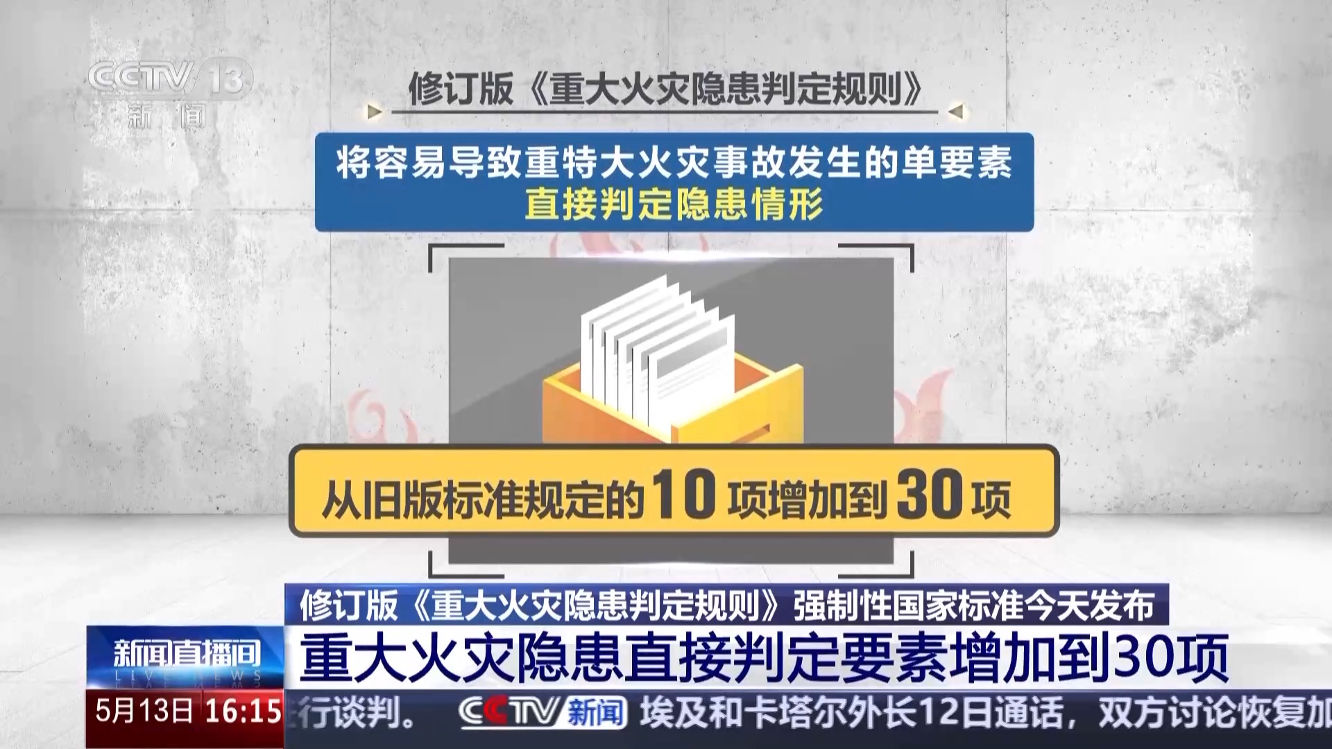 修訂版《重大火災隱患判定規則》強制性國家標準增加了重大火災隱患的直接判定要素,將容易導致重特大火災事故發生的單要素直接判定隱患情形,從舊版標準規定的10項增加到30項,並重點對公共娛樂場所、賓館、商場及集貿市場,兒童活動場所、老年人照料設施、醫院門診樓和病房樓,勞動密集型企業的廠房倉庫等人員密集的室內場所,以及易燃易爆危險品場所分別規定直接判定要素,更加簡便直觀。