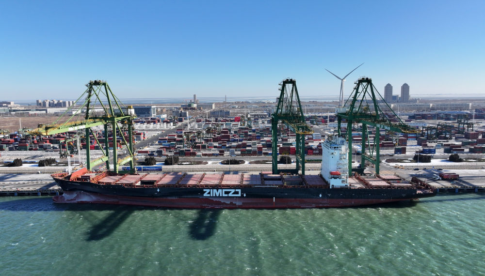 2023年12月21日,“羅安達輪”集裝箱船靠泊在天津港(無人機照片)。當日,“羅安達輪”集裝箱船正式從天津港出發,駛向哥倫比亞、厄瓜多爾、秘魯、智利等南美洲國家,標誌着天津港正式開通天津—南美西新航線。新華社記者 趙子碩 攝
