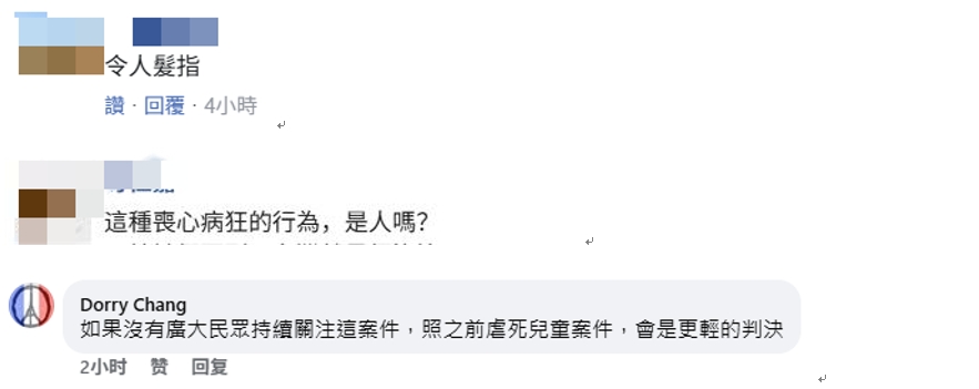 對涉案保姆的惡行,有島內網民在台媒留言區怒批,“令人髮指”“這種喪心病狂的行為,是人嗎?”還有島內網民對該案件產生法院輕判的相關質疑,“如果沒有廣大民眾持續關注這案件,照之前虐死兒童案件,會是更輕的判決”。