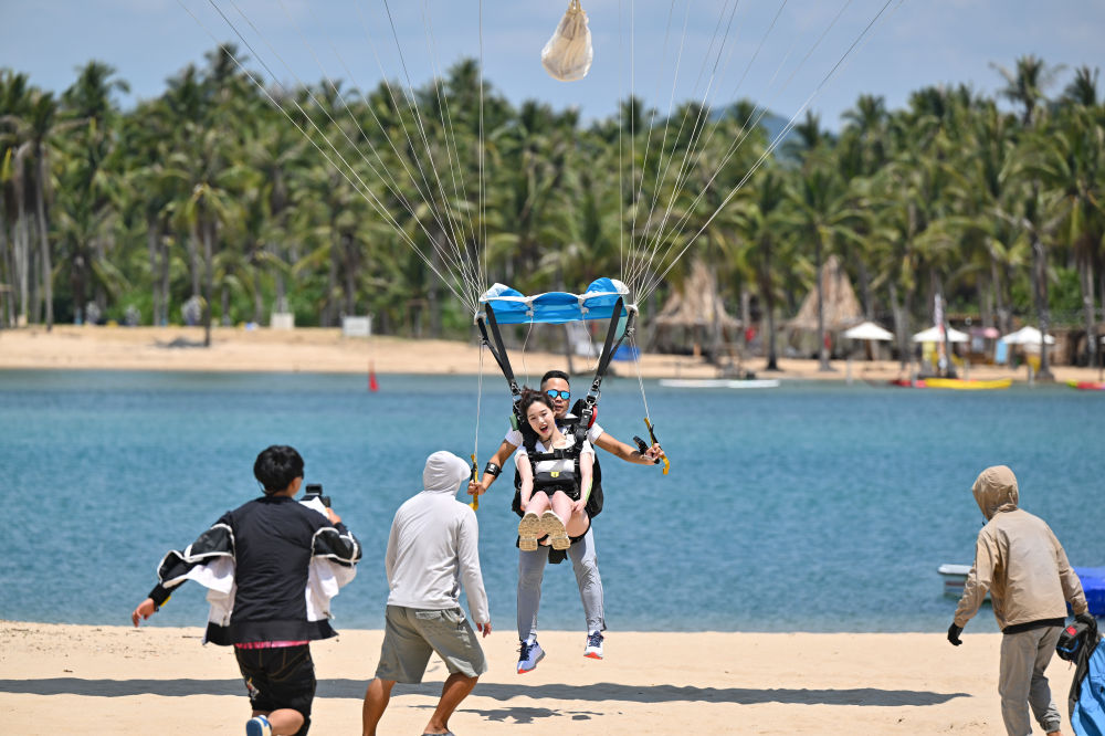 “從空中看三亞的海景,像是打開了新世界!”在海南最大的跳傘基地——三亞塔赫跳傘基地,內蒙古遊客王曉玲體驗了固定翼跳傘後難掩興奮。