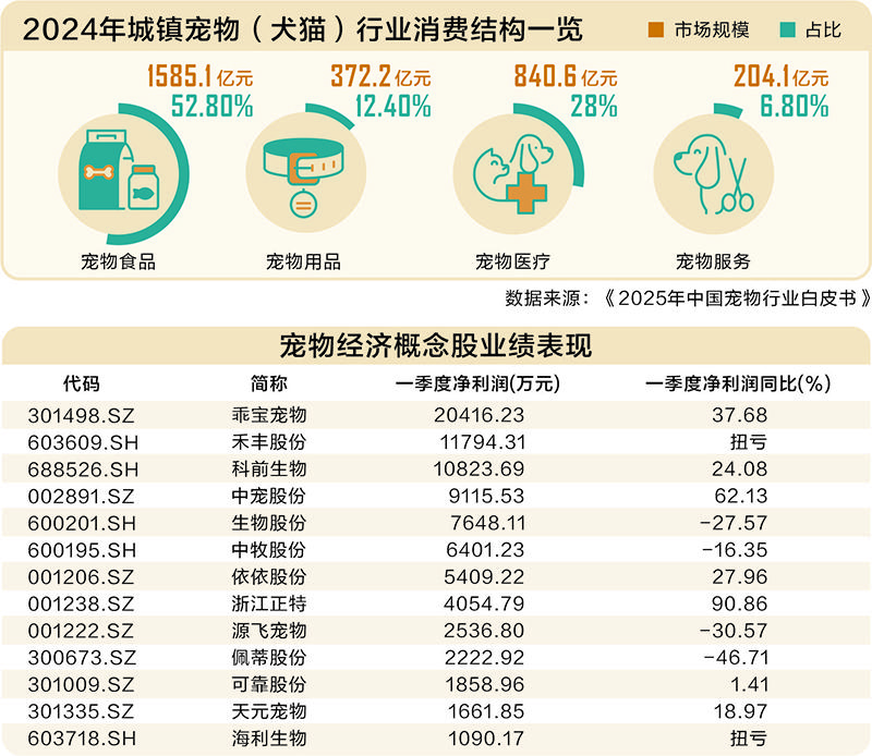 資本市場也反映出寵物經濟的火熱。寵物行業相關上市公司年內股價走勢亮眼,2024年年報及2025年一季報整體業績實現超預期增長。