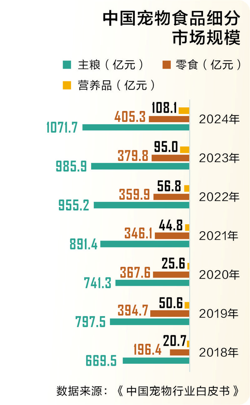 寵物食品分為主糧、零食和營養品三類。其中,主糧為最主要品類,其消費規模遠超另外兩項。2024年寵物主糧市場規模突破1000億元,佔到寵物消費市場的35.7%。
