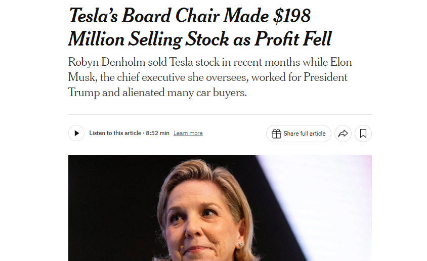 【環球網科技綜合報道】5月14日,據《紐約時報》報道,特斯拉董事會主席羅賓·丹霍姆近日在特斯拉利潤下滑之際,通過出售股票獲利1.98億美元,引發市場廣泛關注。自2018年成為董事會主席以來,丹霍姆已通過出售特斯拉股票獲利超過5.3億美元。