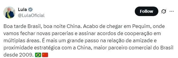 巴西總統盧拉於5月10日至14日對中國進行國事訪問。抵達中國後,盧拉的社交媒體賬號連發多條帖文。