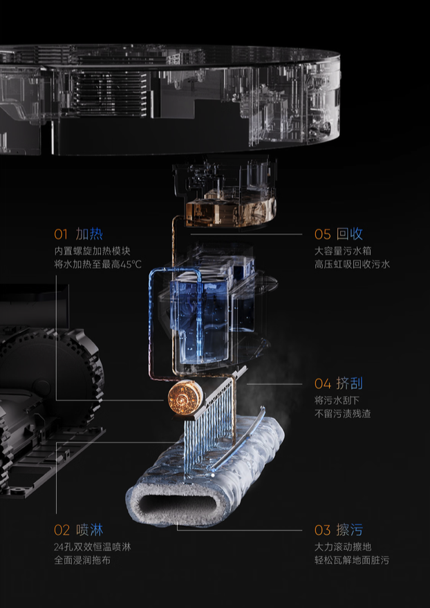 清潔系統方面,內置螺旋加熱模塊將拖布即時加熱至45℃恆温,解決冷水拖地難以溶解油污的問題。配合24孔雙效恆温噴淋系統及最高18N對地壓力,有效瓦解廚房油污等頑固污漬。拖布頂部強力刮條隨滾動瀝出污水,通過氣泵抽氣回收至主機內置污水箱,避免二次污染。同時,拖布旋轉時後部主動蓬鬆滾刷即時梳理絨毛,保持拖布潔淨狀態,形成“拖地—洗拖布—蓬鬆拖布”自清潔循環。