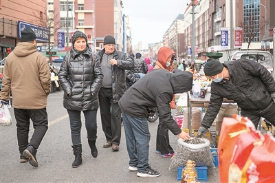 俄羅斯遊客在黑龍江省黑河市逛文化街早市。新華社記者 謝劍飛攝