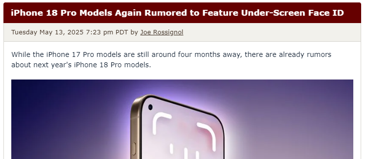 【環球網科技綜合報道】雖然距離 iPhone 17 Pro 機型上市還有大約四個月的時間,但已經有關於明年 iPhone 18 Pro 機型的傳言。5月14日消息,據外媒報道,Counterpoint Research副總裁羅斯·楊(Ross Young)社交媒體上發文暗示iPhone 18 Pro機型將配備屏下Face ID系統。