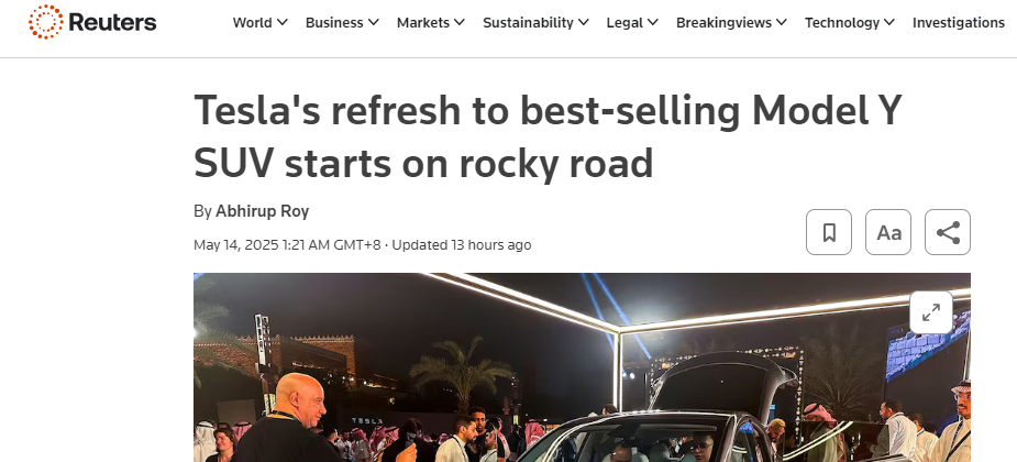 【環球網科技綜合報道】5月14日,據路透社報道,特斯拉新款Model Y的推出並未如預期般引爆市場,反而因超低融資利率和充足供應引發了市場對需求疲軟的擔憂。