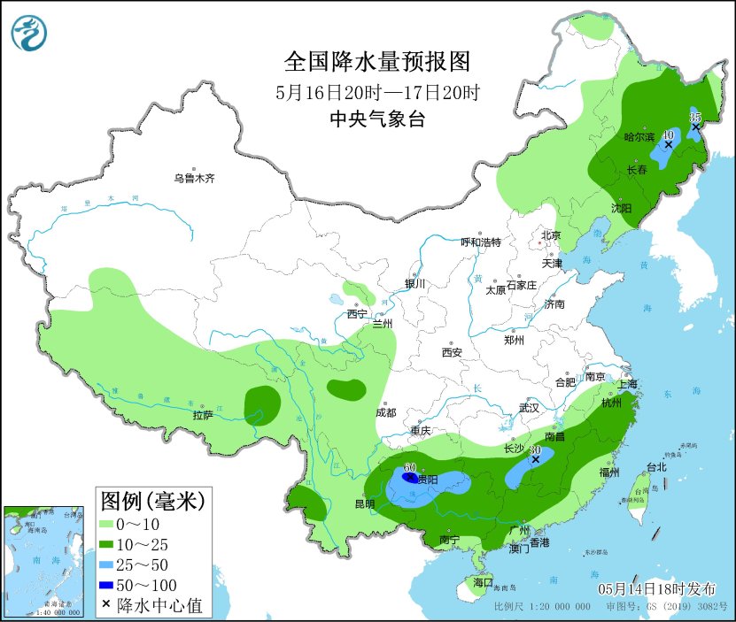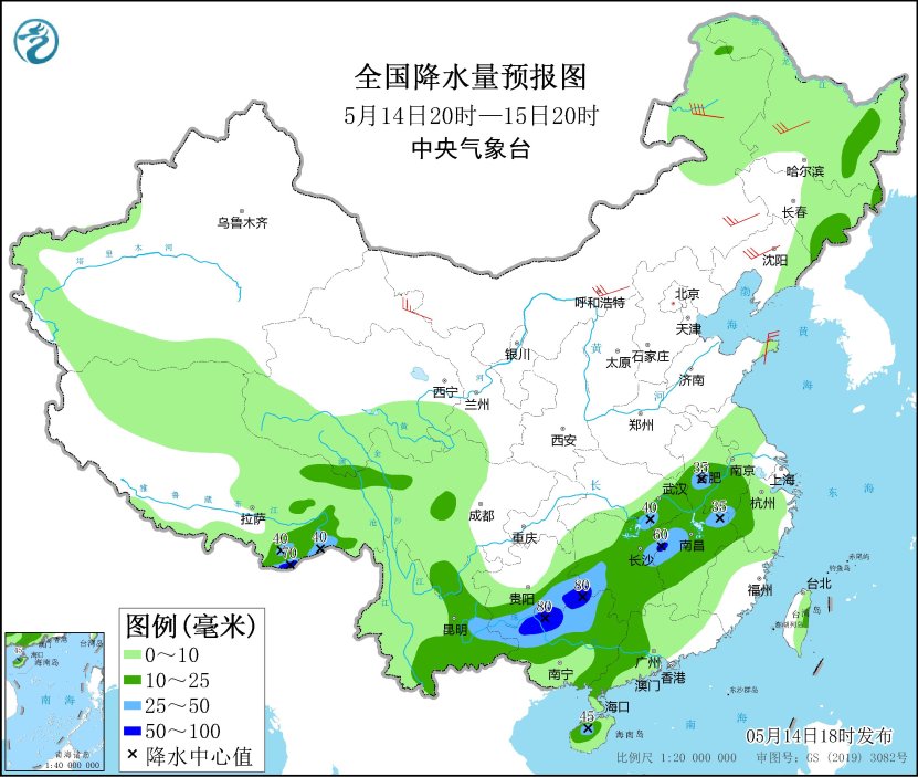 *5月14日20時至15日20時,*黑龍江東部、吉林東部、西藏東部、青海南部、川西高原北部、西南地區東南部、江淮西部、江漢東部、江南中北部和西部、華南北部和西部、海南島、台灣島等地部分地區有中到大雨,其中,西藏東南部、貴州東南部、湖南西南部和東部、廣西北部等地部分地區有暴雨(50~80毫米)。內蒙古中東部、甘肅河西、東北地區西部、山東半島等地部分地區有4~6級風,其中,內蒙古東北部部分地區有6~7級風、陣風8~9級(見圖1)。