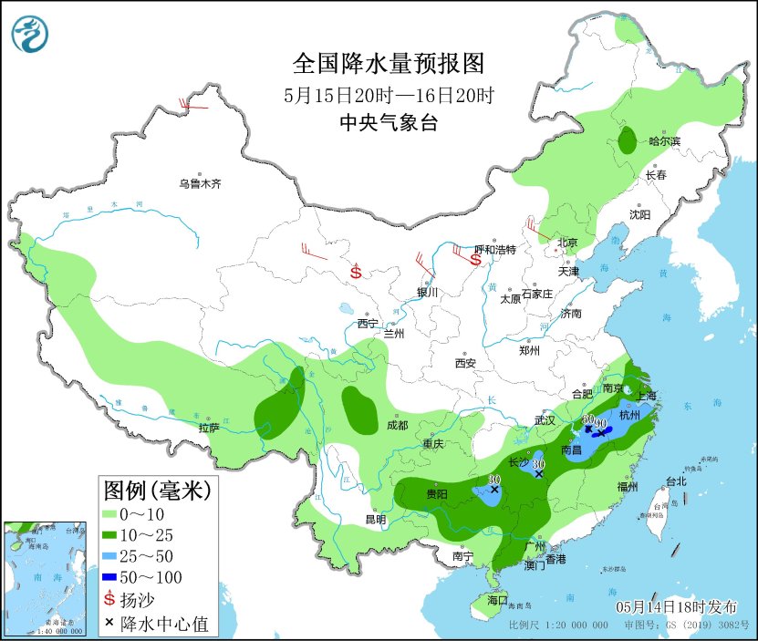 *5月15日20時至16日20時,*西藏東部、貴州南部、湖南中南部、江西北部、浙江、廣東西部和北部、廣西北部等地部分地區有中到大雨,其中,江西東北部、浙江西南部等地部分地區有暴雨(50~90毫米)。新疆北疆北部、內蒙古西部、甘肅河西、寧夏北部、河北北部等地部分地區有4~6級風,並伴有沙塵;渤海、渤海海峽有4~6級風、陣風7級(見圖2)。