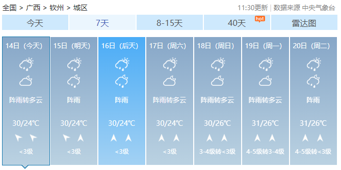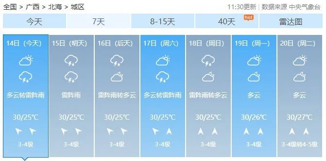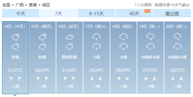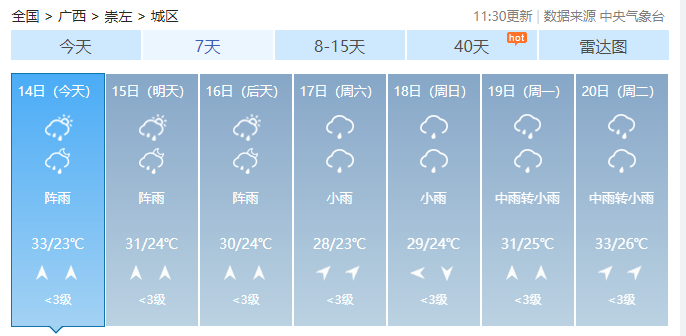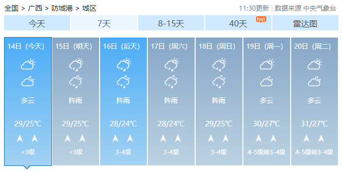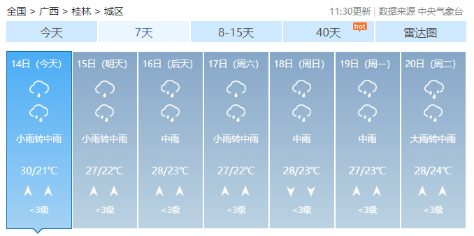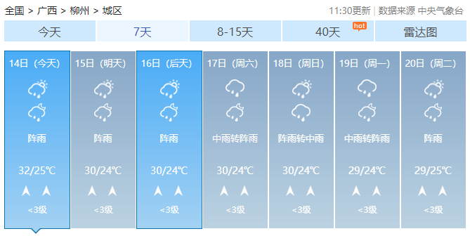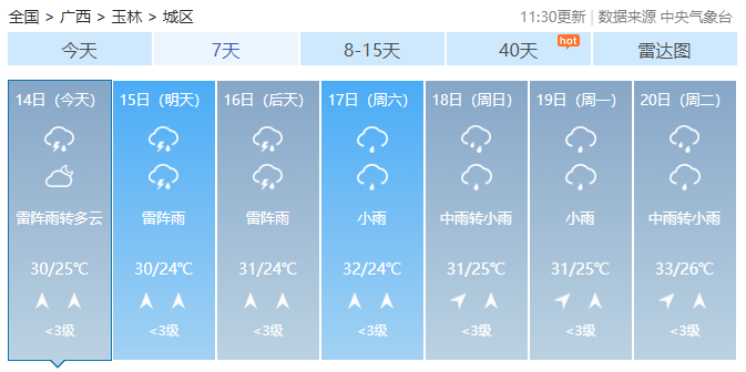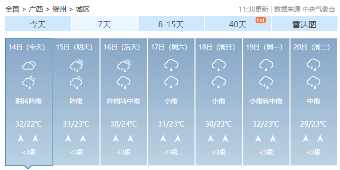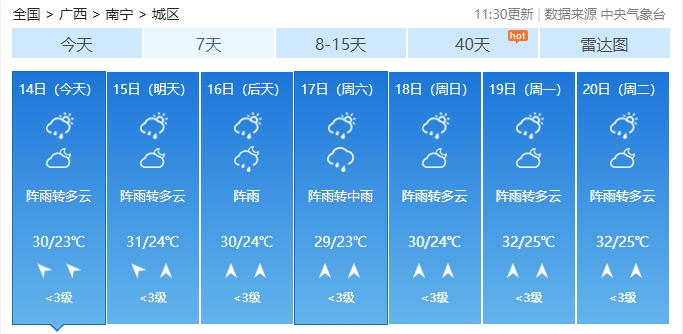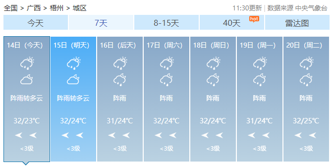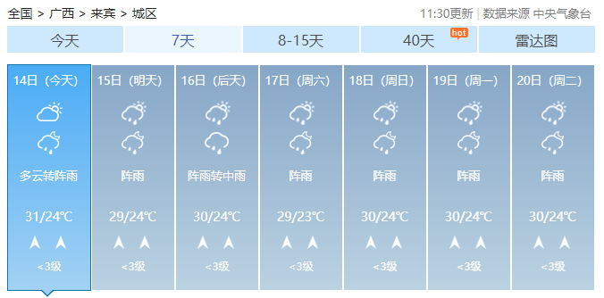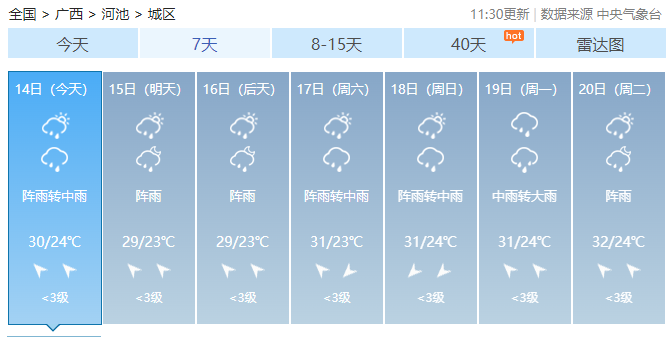 14日晚上到15日白天,百色、河池、柳州等市有大雨、局地暴雨或大暴雨並伴有短時雷暴大風、冰雹等強對流天氣,其他地區多雲到陰天有陣雨或雷雨、局地大雨。