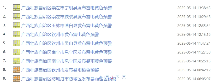 截至5月14日,廣西多地發佈雷電預警、暴雨預警。圖源:中國天氣廣西站