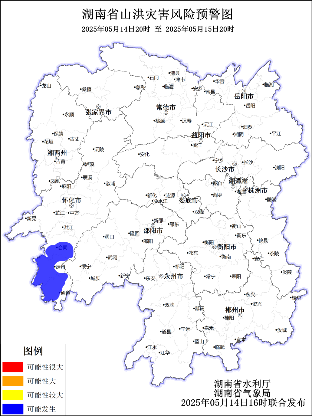 根據湖南省氣象局5月14日預報,省水利廳與省氣象局聯合會商得出如下結論:受降雨影響,5月14日20:00至15日20:00,邵陽市西南部,懷化市西南部等局地可能發生山洪災害。