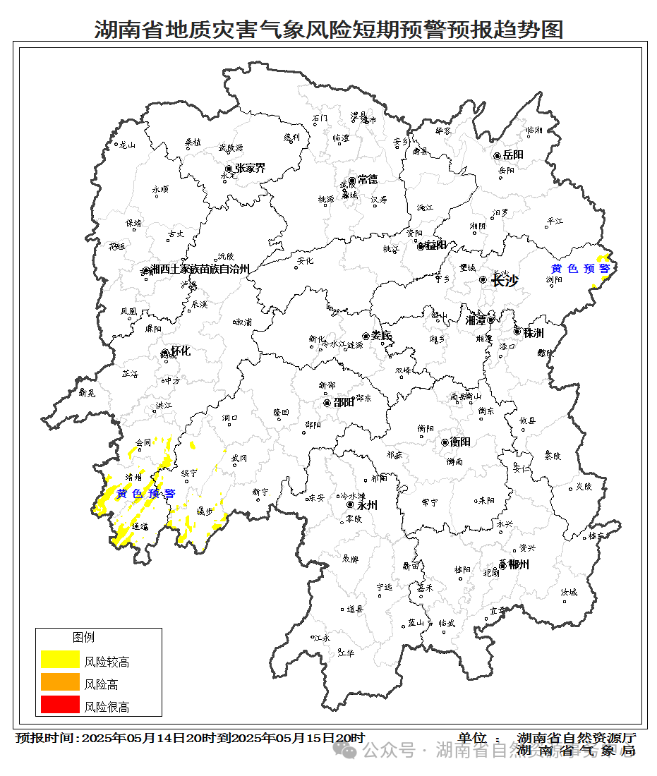 根據地質災害成災規律和孕災條件,結合2025年5月14日短期氣象預報情況,省自然資源廳與省氣象局聯合會商得出如下結論:自5月14日20:00至15日20:00,受降雨影響,湘東北、湘西南的長沙、邵陽、懷化等市州山地丘陵**區發生突發性地質災害風險較高(黃色預警)。