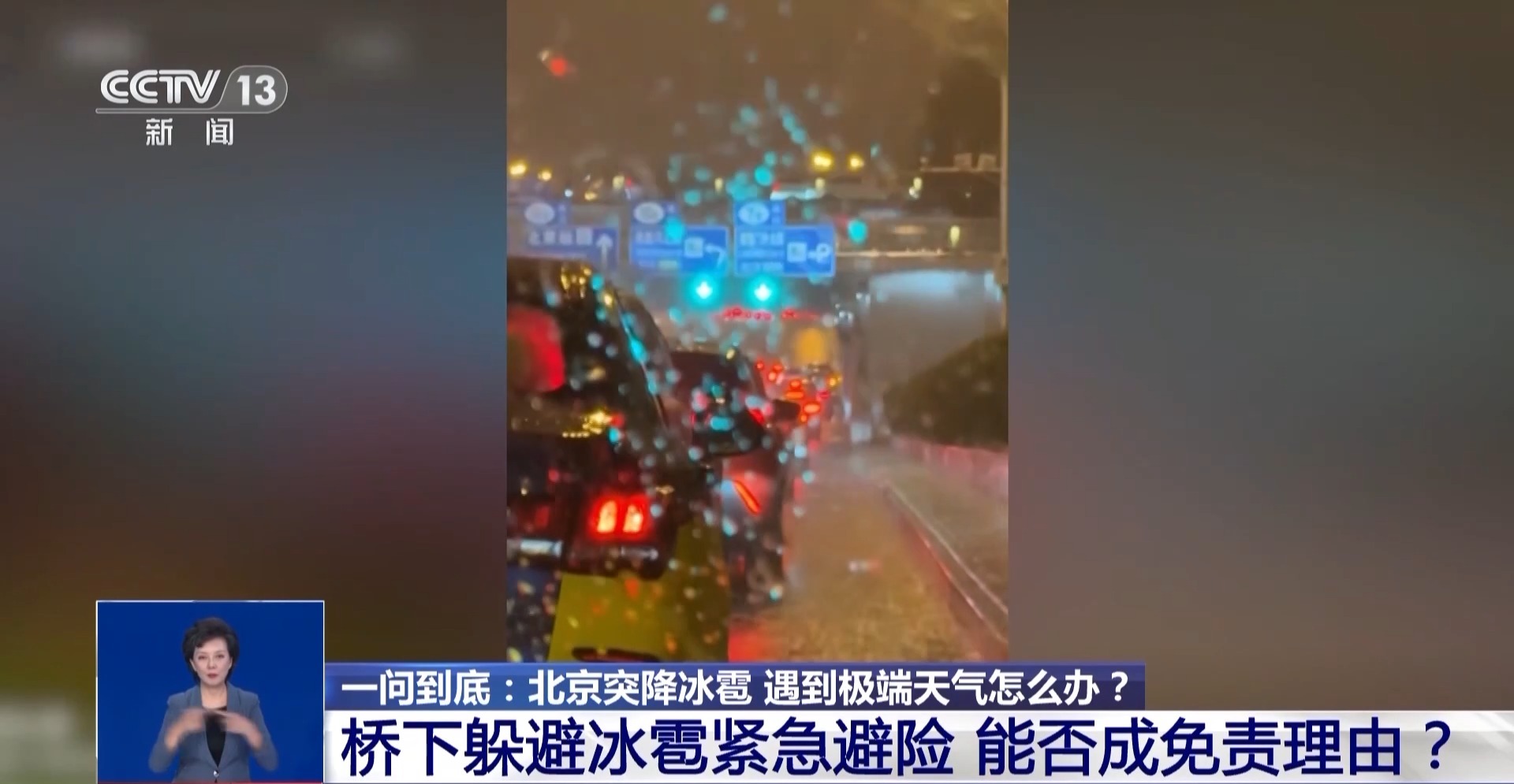 *中國政法大學可持續交通創新中心研究員 鄭飛:*我們要具體情況具體分析,如果這個時候他們看到前面有冰雹,首先是靠邊停車,至少是要讓出一個車道,這種是正常的處理。但是在緊急情況之下,大家都看到前面確實有危險,他不可能冒着危險再前進,這種情況下臨時停車,我覺得算是一種緊急避險。這是趨利避害的本能,有一句話叫,法律不能強人所難。