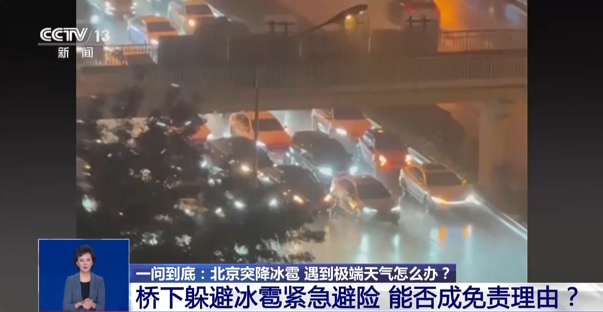 *中國政法大學可持續交通創新中心研究員 鄭飛:*如果冰雹天氣中以橋洞作為避險地點,但是長時間停靠,甚至阻礙了公共交通,引起了交通擁堵或者事故的,就要看具體的情況,看是否超過了一個必要的避險限度。如果超過了,可能會造成交通中斷,侵害其他車輛的避險機會,有可能會面臨行政處罰和相應的民事責任。