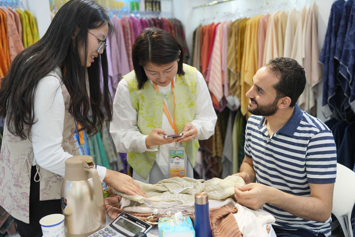 一名來自埃及的客商在2024中國紹興柯橋國際紡織品面輔料博覽會(春季)上選購面料(2024年5月6日攝)。新華社記者 翁忻暘 攝