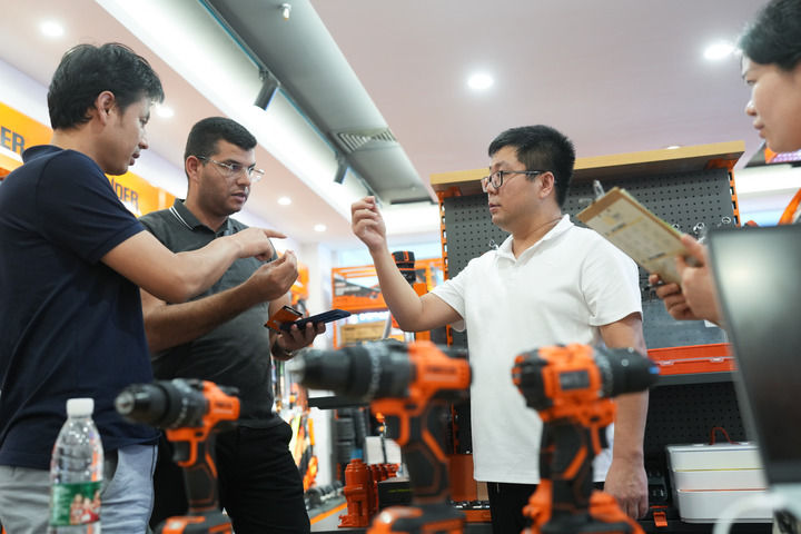 在義烏國際商貿城,商户向突尼斯客商介紹一款電鑽(2024年10月9日攝)。新華社記者 翁忻暘 攝