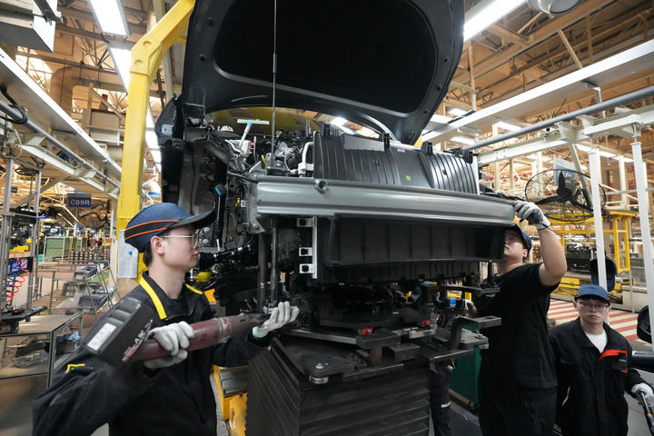 在吉利汽車臨海製造基地,工作人員為新能源車安裝電池包(2025年4月8日攝)。新華社記者 翁忻暘 攝
