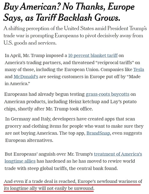報道認為,由於本屆美國政府對待盟友的方式給歐洲造成了不斷加劇的痛苦,即使雙方日後達成貿易協議,歐洲對美國新萌生的戒心也很難輕易消除。
