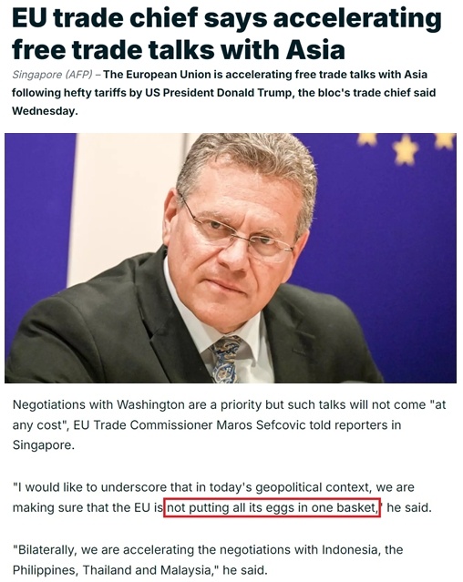 他表示,雖然與美國的談判是優先事項,但歐盟不會為了談判不計代價,“在當今的地緣政治背景下,我們要確保不把所有雞蛋都放在一個籃子裏”。