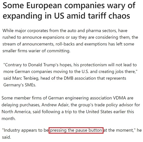 據路透社報道,由於美國關税政策的反覆無常增加了運營成本並可能引發美國經濟衰退,一些歐洲中小企業已開始重新考慮是否繼續在美擴張。