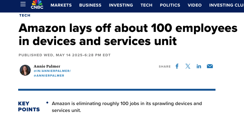 【環球網科技綜合報道】5 月 14 日消息,據外媒CNBC報道,亞馬遜公司於週三證實,將在其設備和服務部門裁員約 100 人。